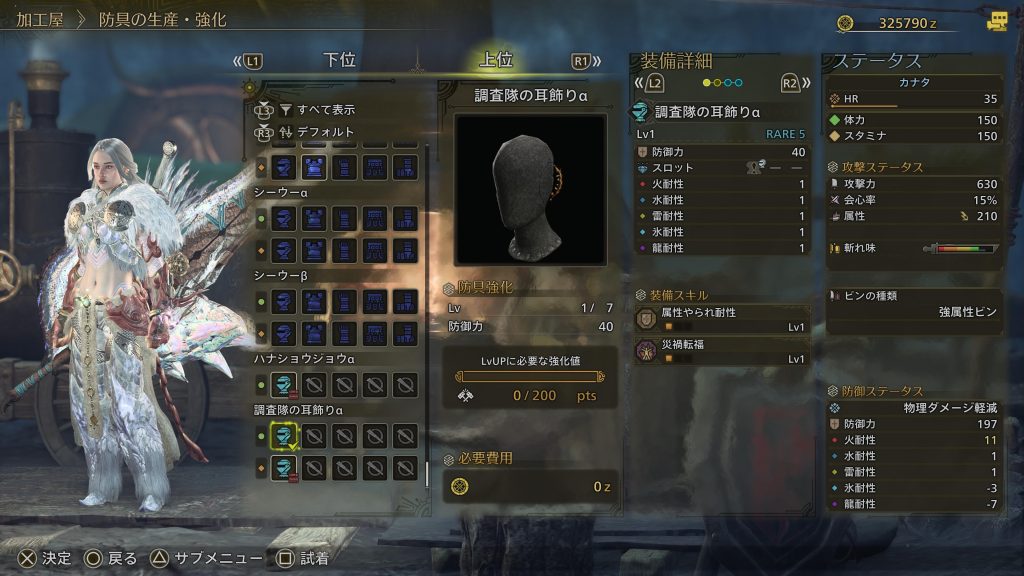 調査隊の耳飾りαを2種類作って1つ装備してみた。