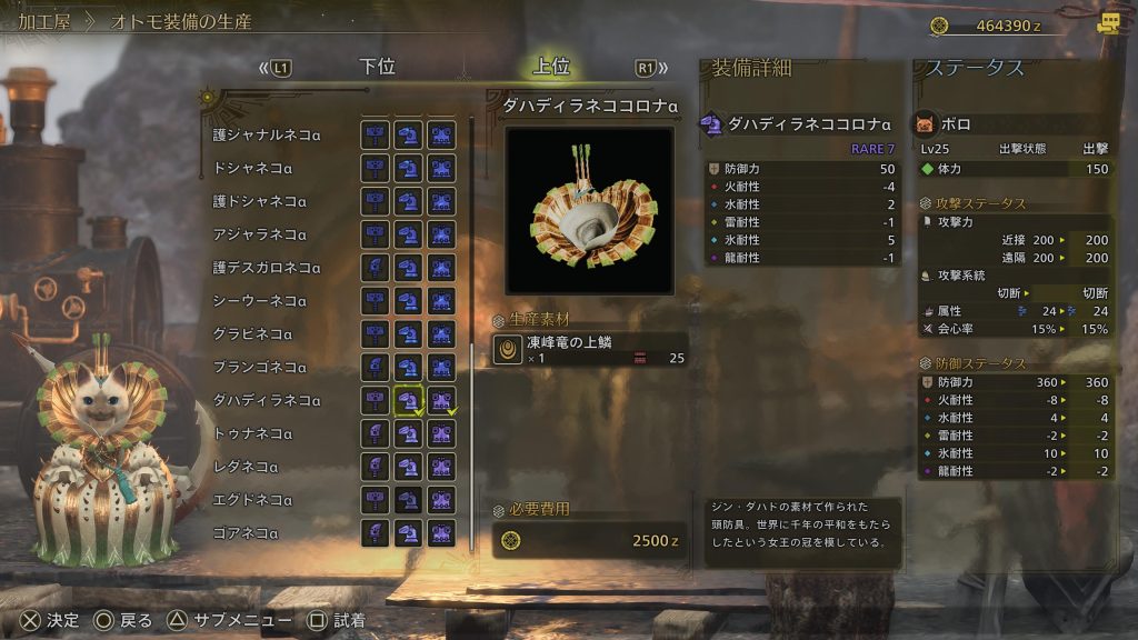 オトモもダハディラネコαにして防御力アップ。