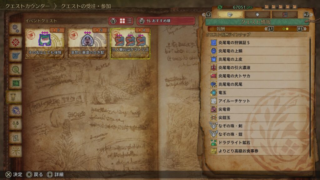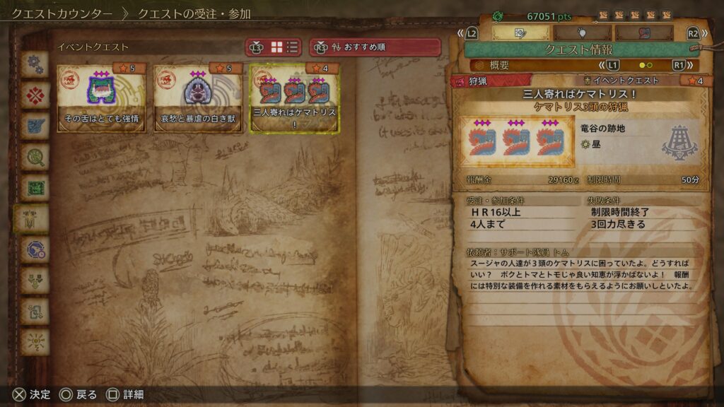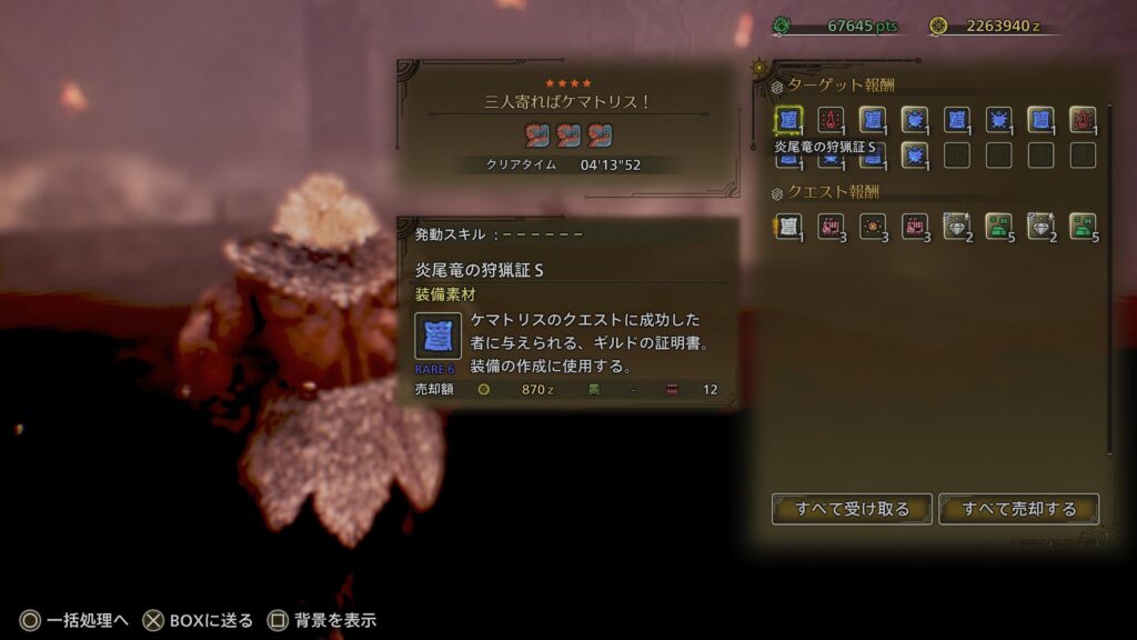 狩猟証がたくさん出るみたいだからケマトリス装備とか作るのに良さそう。