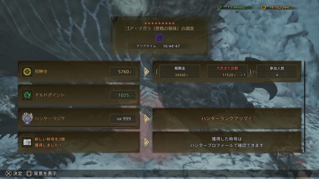 私はどちらかというとハンターランクが高いと恥ずかしいなと思ってしまう方なので嬉しいというよりは上がってしまったかーという感じ。