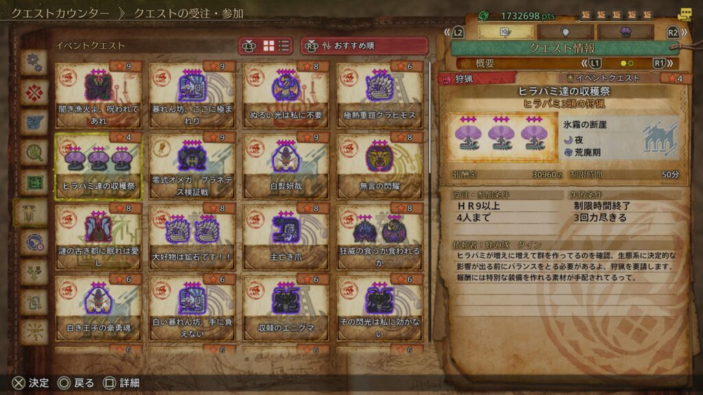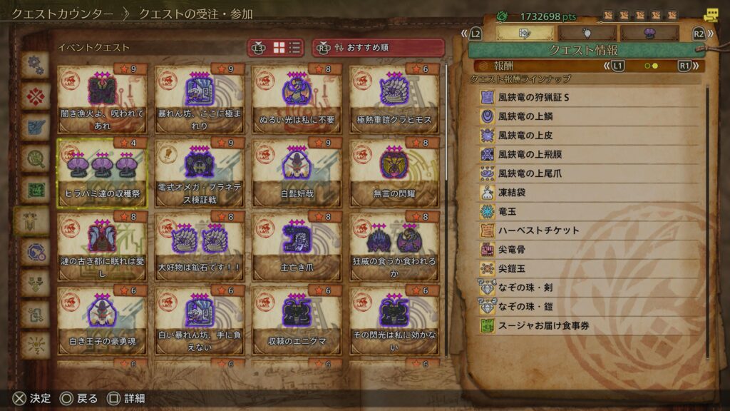 今回のハーベストチケット、装備を全部作ろうとすると枚数がかなり必要だからそれなりにヒラバミと戦う事になる。